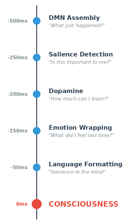 The time intervals shown (e.g. 500ms, 250ms, etc.) are illustrative processing windows, not fixed or strictly sequential stages. Neural processing unfolds in parallel and with substantial overlap. Empirical work suggests that perceptual categorisation, salience detection, and dopaminergic prediction-error signalling occur within ~100–300ms of stimulus evaluation (Schultz et al., 1997; Bayer & Glimcher, 2005; Seeley et al., 2007). Prefrontal integration and reportable conscious awareness typically emerge within a broader ~300–600ms window, depending on task demands and attentional state (Kounios & Beeman, 2014; Lau & Rosenthal, 2011; Fleming & Dolan, 2012). The half-second timeline used in this essay reflects a simplified, averaged integration window across these overlapping processes, rather than a discrete step-by-step chain.