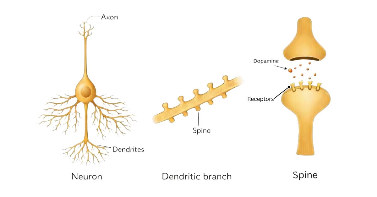 All up and down the dendrite branches of these neurons are little satellite dishes (spines) that are covered in tiny chemical switches called dopamine receptors. In aggregate, these binary switches function like a sensor, activated by free-floating dopamine.